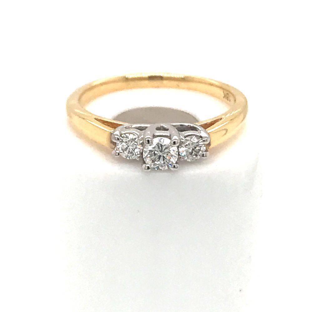Three graduated round brilliant cut diamonds each four claw set in white gold on a 18ct yellow gold shank. 0.33ct total diamond weight. Approximately G/H colour, Si clarity.