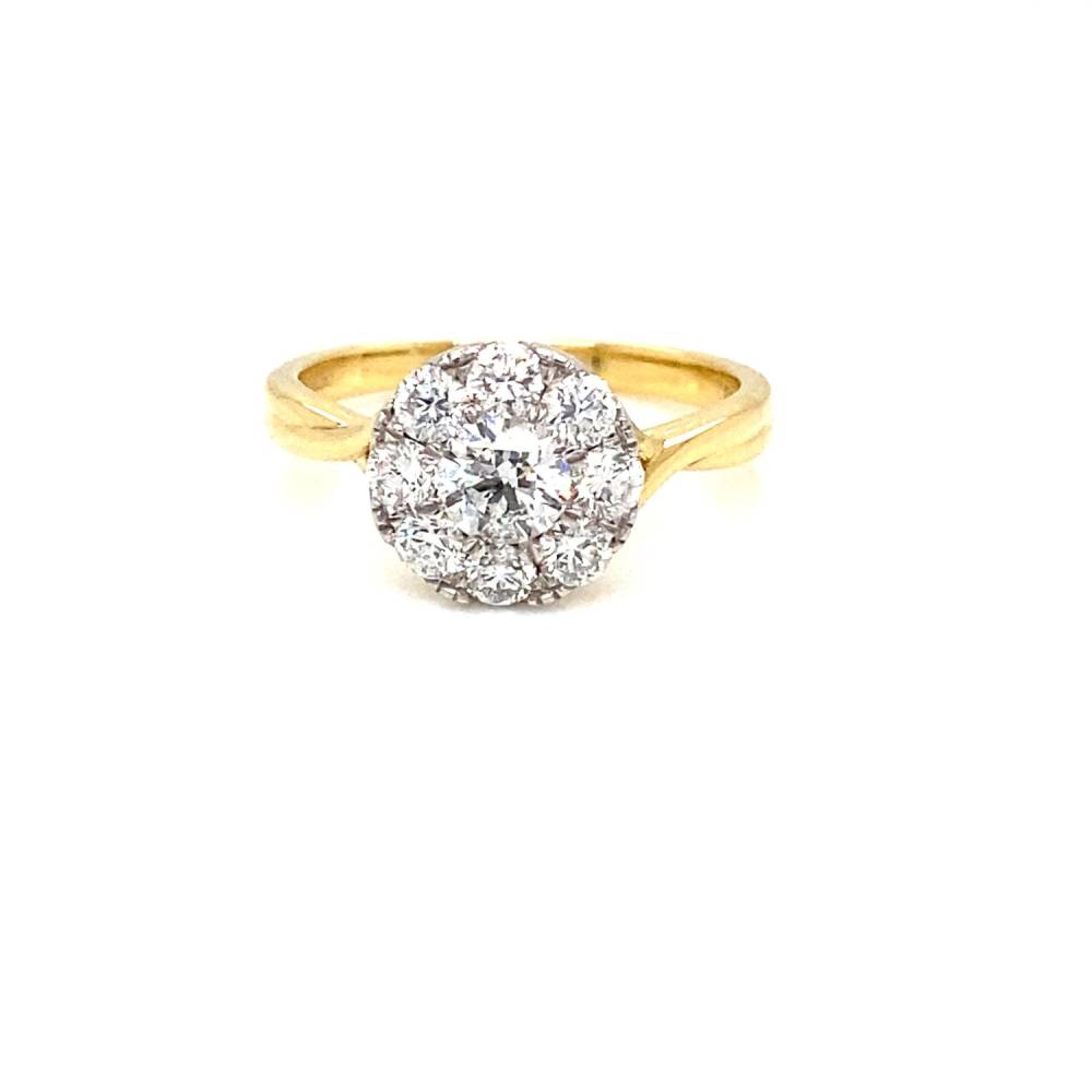 18ct yellow gold round brilliant cut diamond nine stone round cluster ring. This ring gives the look of a 3.00ct diamond solitaire. 1.00ct total diamond weight.