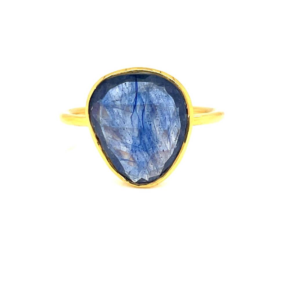 18ct yellow gold ring set with a large organic shaped rose cut sapphire. A unique, one off piece.