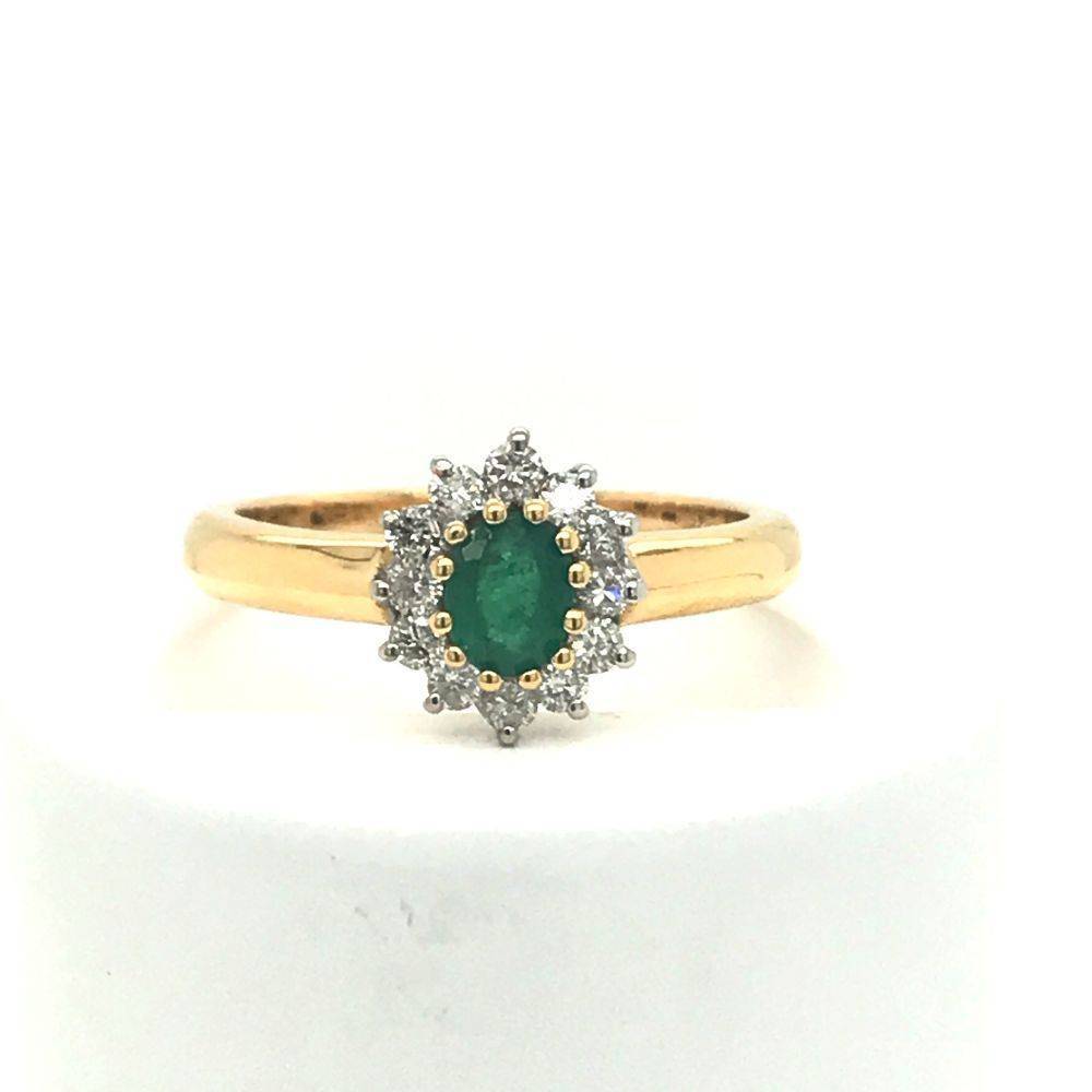 18ct yellow gold emerald and diamond ring. An oval emerald claw set in yellow gold is surrounded by a cluster of twelve smaller round brilliant cut diamonds claw set in white gold on a 18ct yellow gold shank. Total diamond weight 0.25ct