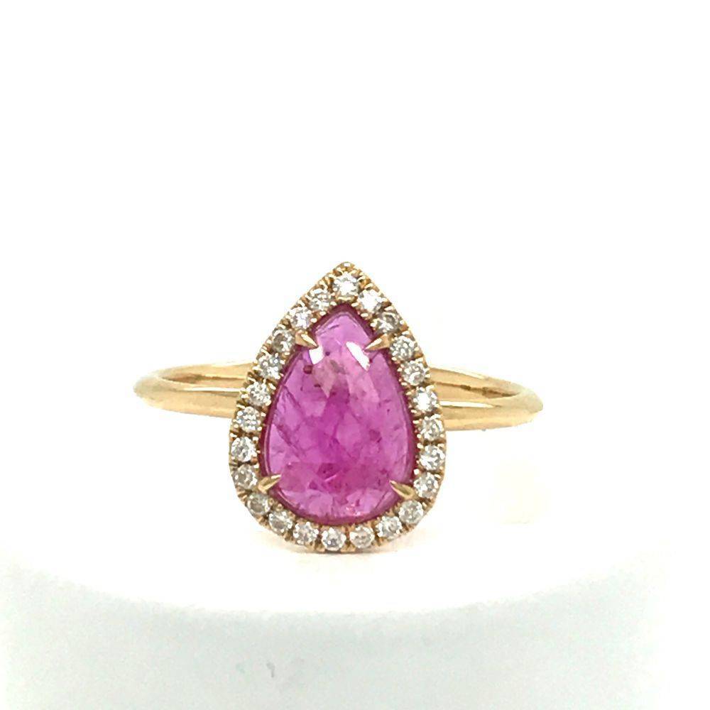 18ct yellow gold pear shaped rose cut ruby in a four claw setting surrounded by a halo of twenty four smaller round brilliant cut diamonds. Ruby 1.29ct and diamonds 0.15ct total weight.