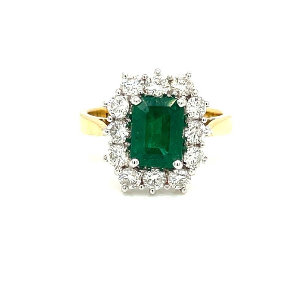 A central rectangular emerald cut emerald is surrounded by a cluster of round brilliant cut diamonds all claw set in white gold on a 18ct yellow gold shank. 1.55ct emerald and 0.95ct total diamond weight.