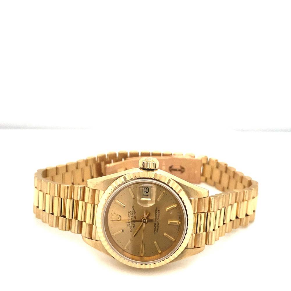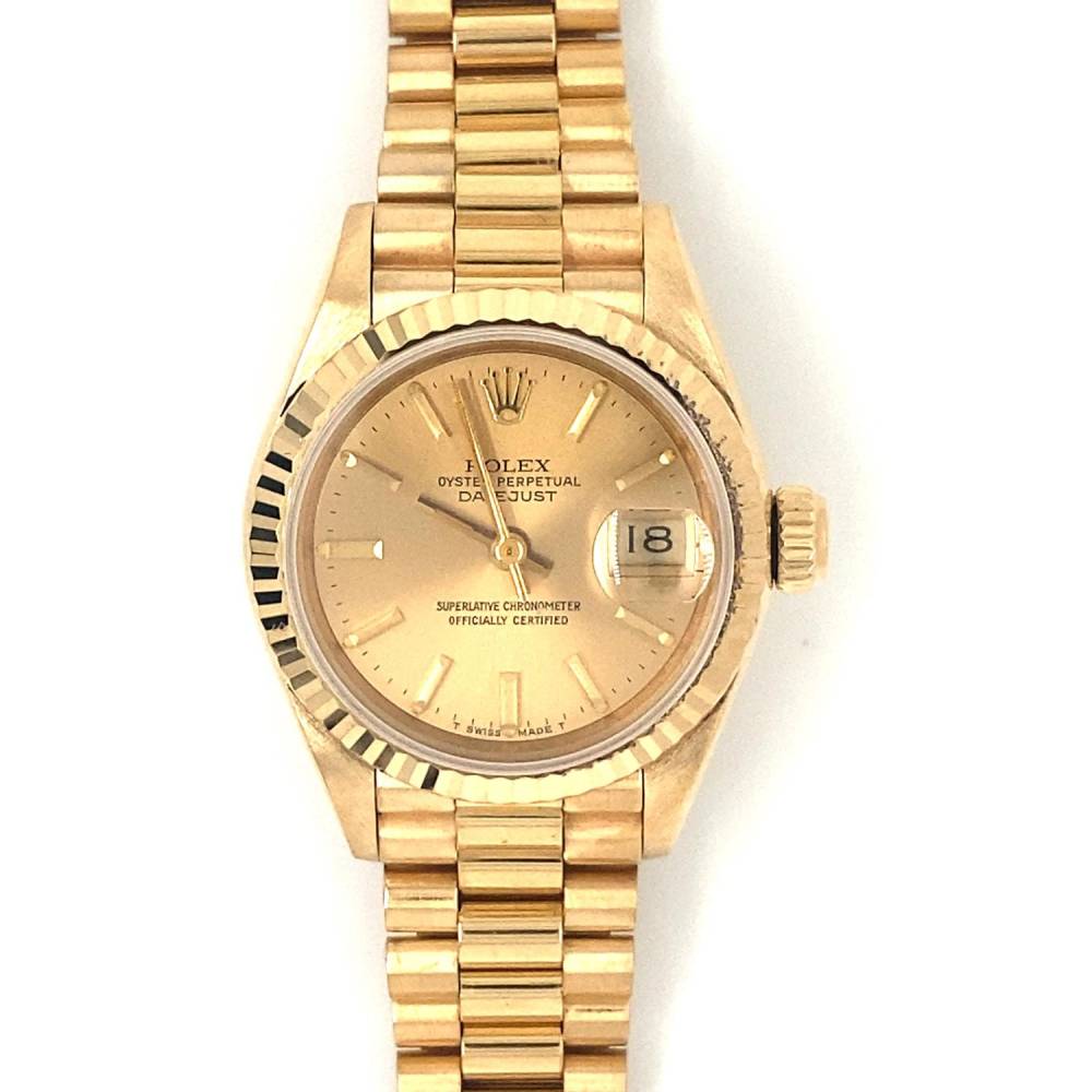 18ct yellow gold Rolex Lady Datejust watch, champagne baton dial with a fluted bezel on a president 18ct gold bracelet. Year 1984. Original papers. Generic box. 26mm case. This watch has been refurbished and comes with a 1 year warranty.