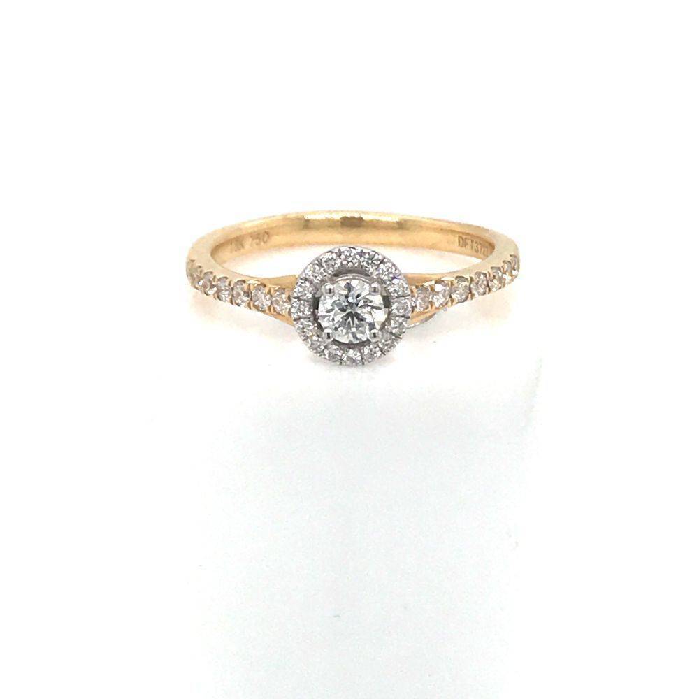 18ct yellow gold round brilliant cut diamond ring with a halo of smaller diamonds and claw set diamond set shoulders. Total diamond weight 0.43ct. This ring has a ring certificate, D colour, Si1 clarity.