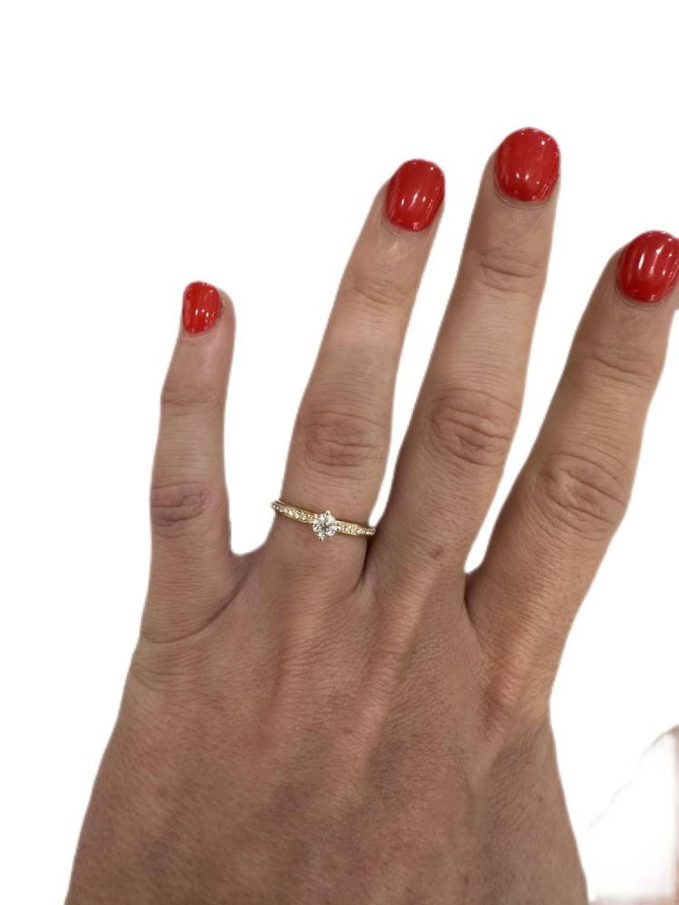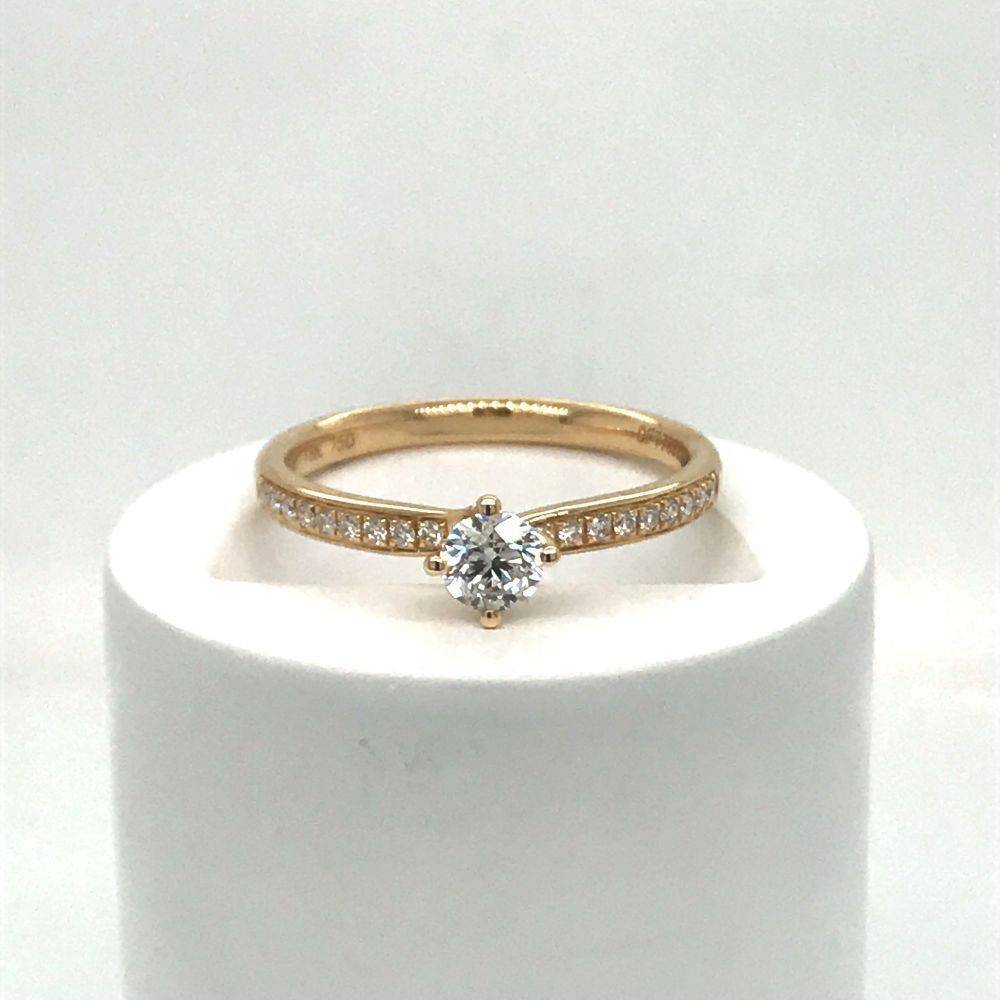 Single round brilliant cut diamond four claw set on a twist in a 18ct yellow gold ring mount with grain set diamond set shoulders. Total diamond weight 0.41ct. H colour. Si2 clarity. Ring certificate.