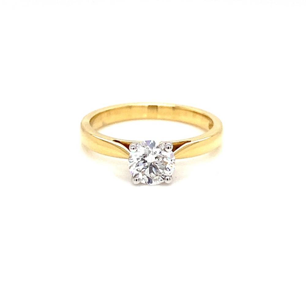 A single round brilliant cut diamond four claw set in white gold on a 18ct yellow gold shank. 0.80ct diamond. IGI certificated H colour, Si2 clarity.