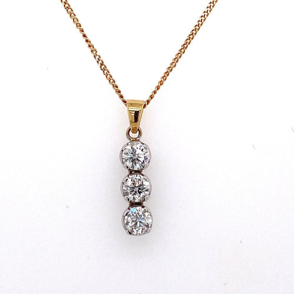 Three round brilliant cut diamonds each four claw set in white gold in a drop pendant on a 18″” 9ct yellow gold curb chain. 1.04ct diamond. Approximatley G/H colour. Si clarity.