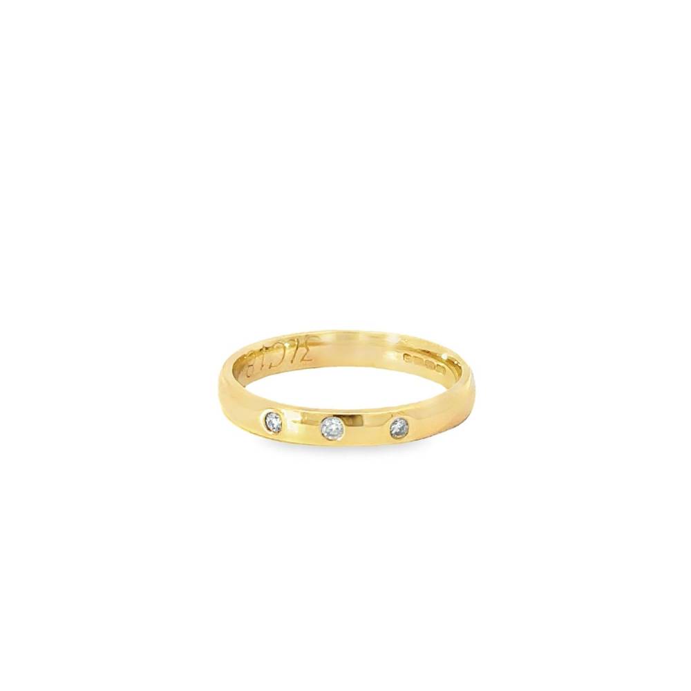 18ct yellow gold 3mm court shaped wedding ring flush set with three round brilliant cut diamonds. This ring is available in different widths and different precious metals please enquire for more details.