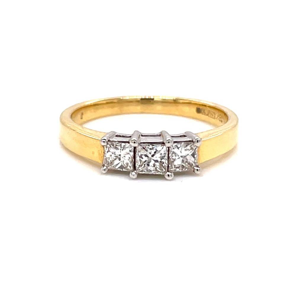 Three graduated princess cut diamonds each four claw set in white gold on a 18ct yellow gold shank. 0.50ct total diamond weight, approximately G/H colour, Si clarity.