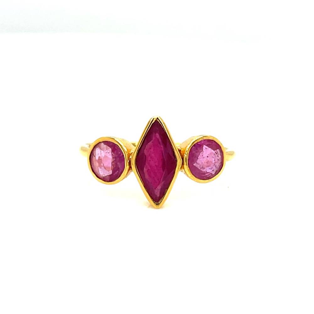 18ct yellow gold three stone diamond shaped and round ruby rub over set ring. This is a one off unique ring.