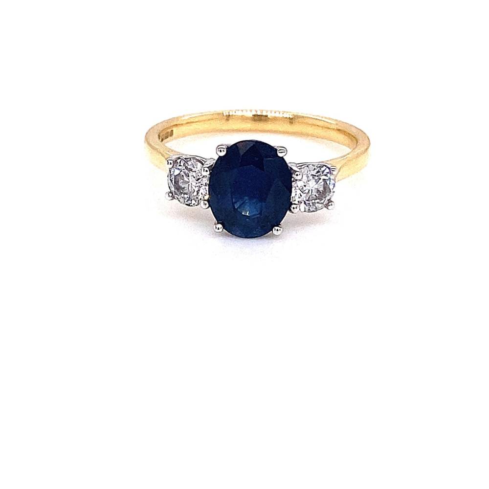 18ct yellow gold three stone oval sapphire and round brilliant cut diamond ring. Stones are claw set in white gold on a yellow gold shank. 1.62ct sapphire and 0.51ct total diamond weight.