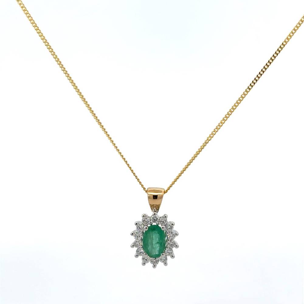 18ct yellow & white gold emerald & diamond oval cluster pendant claw set in white gold on a 9ct yellow gold 42cm fine curb chain. 0.20ct total diamond weight.