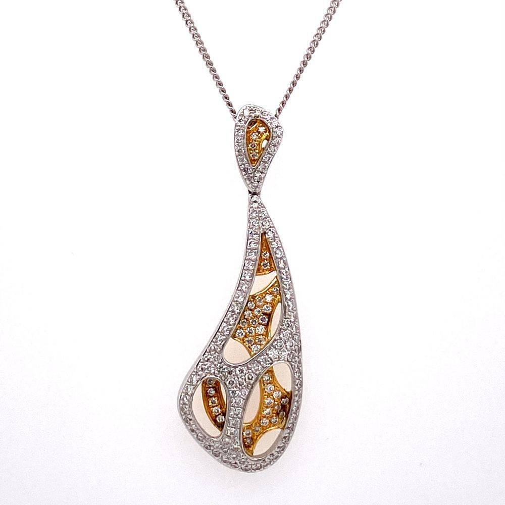 18ct yellow and white gold fancy shaped pendant pave set with round brilliant cut diamonds. This pendnat is on a 18ct white gold 16″” curb chain. 0.71ct total diamond weight.