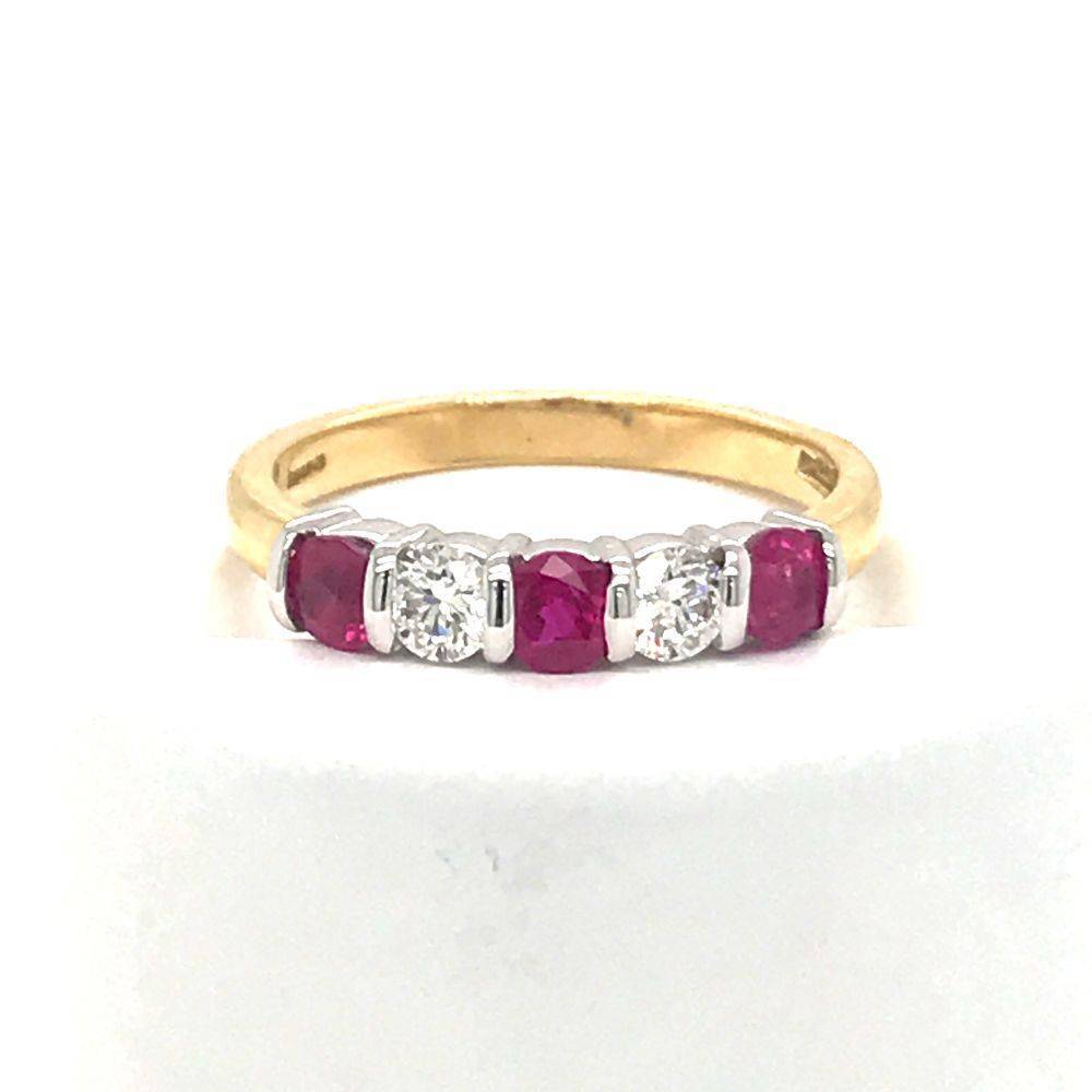 18ct yellow gold five stone round ruby and round brilliant cut diamond bar set in white gold half eternity style ring. Rubies 0.73ct total weight and diamonds 0.29ct total weight.