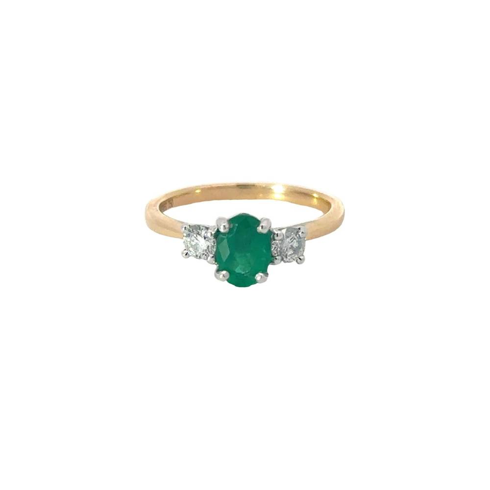 Three stone oval emerald and round brilliant cut diamond three stone ring, claw set in white gold on a 18ct yellow gold shank. 0.35ct total diamond weight. Emerald measures 7mm x 5mm.