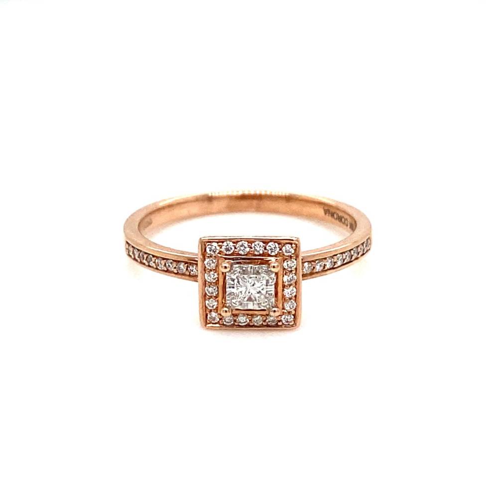 9ct rose gold princess cut diamond halo cluster style ring with diamond set shoulders. 0.20ct total diamond weight.