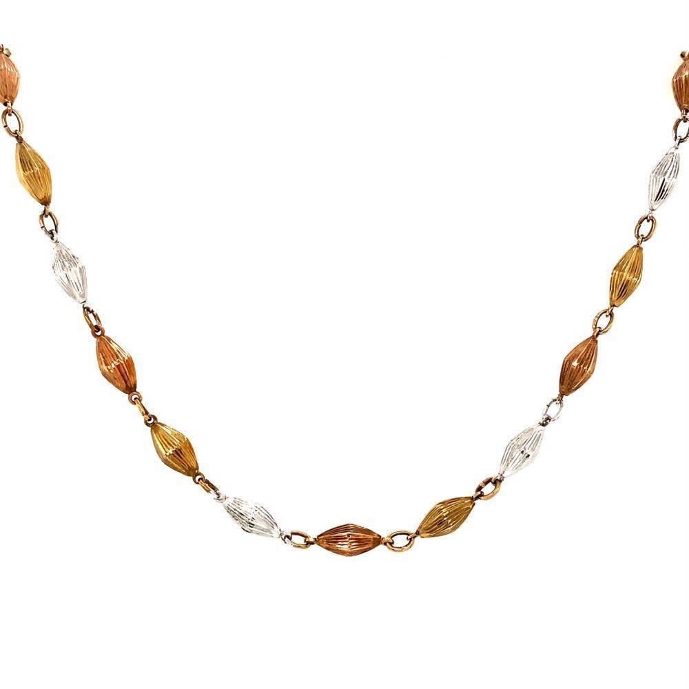 9ct yellow, white and rose gold three colour alternated faceted marquise bead link necklace. Length 18″”.