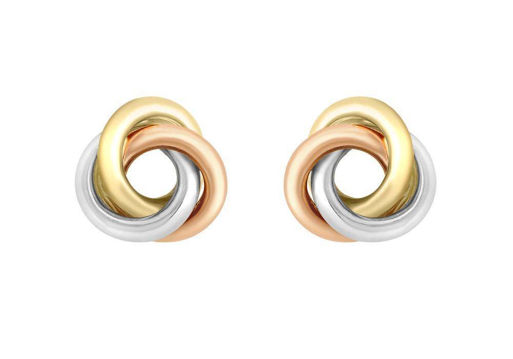 9ct yellow white and rose gold small knot stud earrings. Diameter 8mm.