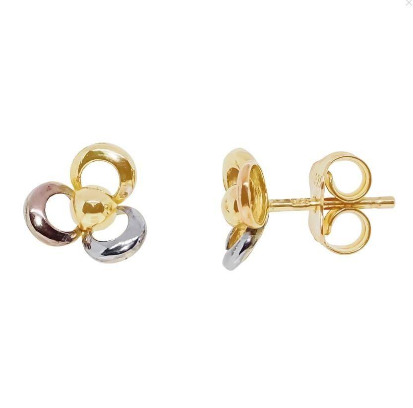 9ct yellow, white and rose gold three colour three open petal stud earrings.
