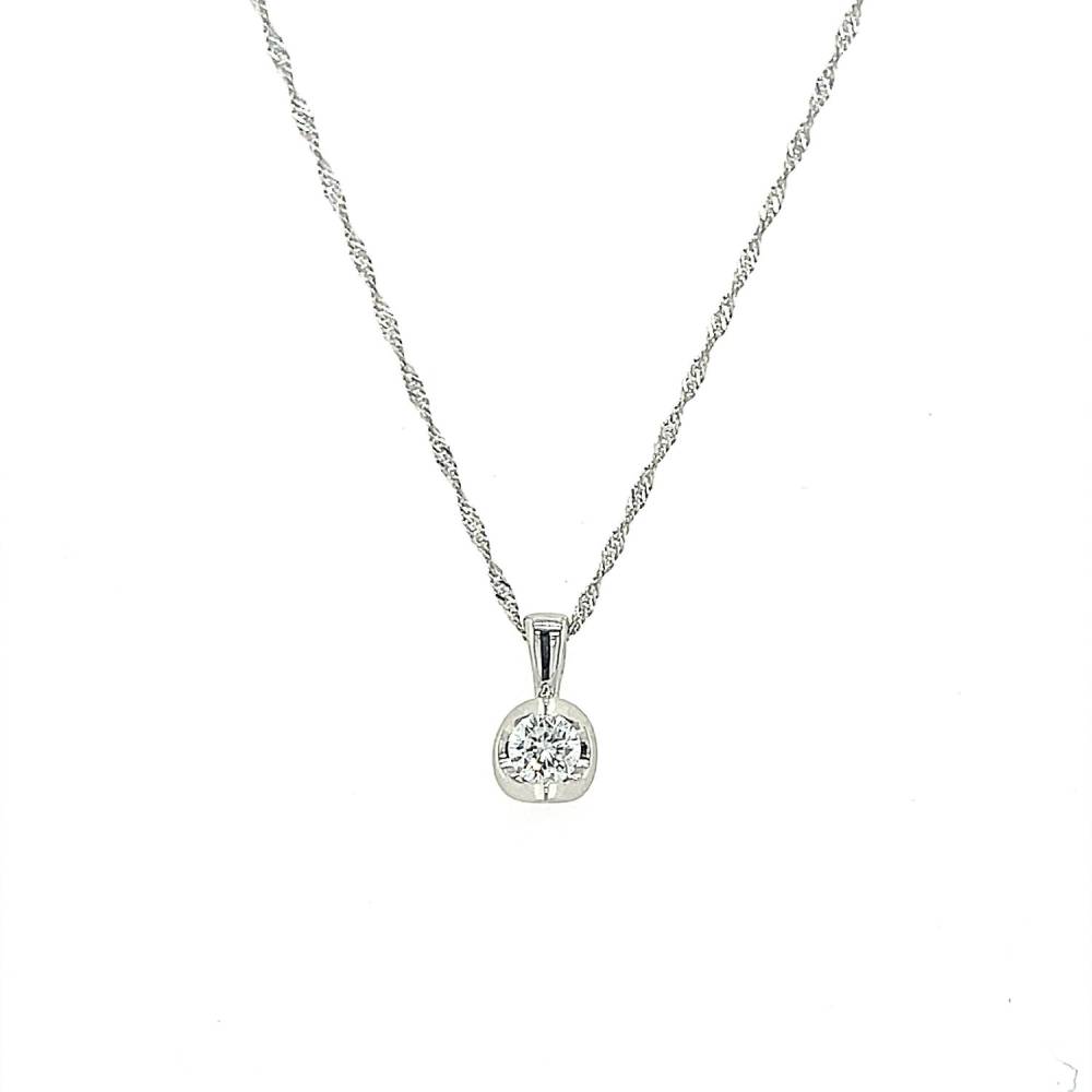 9ct white gold single stone round brilliant cut diamond pendant in an arch shaped setting on a 18″ white gold chain.