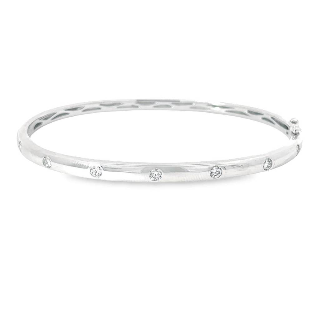 9ct white gold oval hinged bangle set with seven flush set round brilliant cut diamonds. A simple push in catch and safety arm for extra security. 0.50ct total diamond weight,