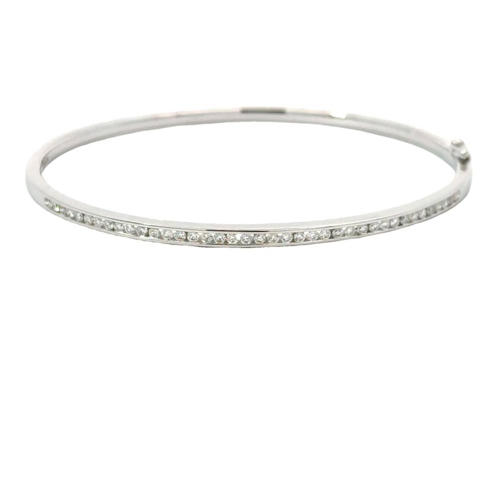 9ct white gold bangle adorned with round brilliant cut diamonds in a channel setting. 0.62ct total diamond weight. This is a hinged bangle and has a safety arm.
