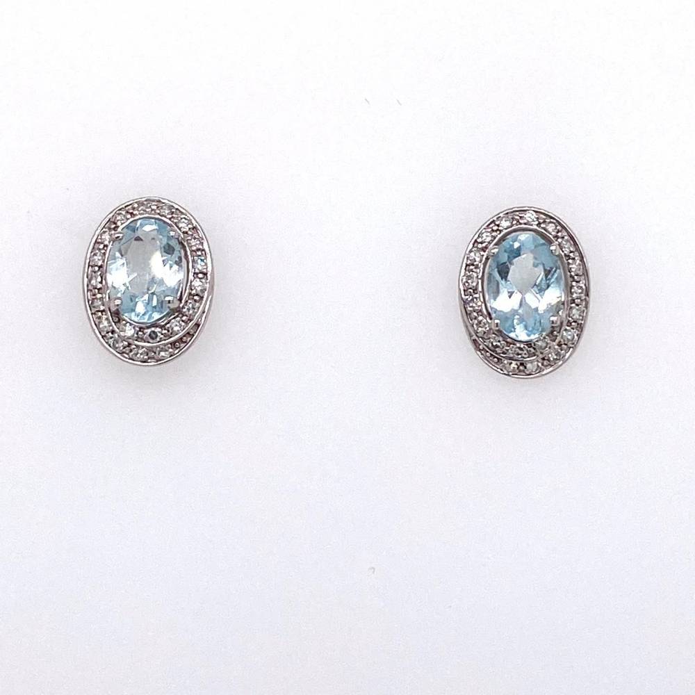 9ct white gold blue topaz and diamond comma swirl stud earrings.