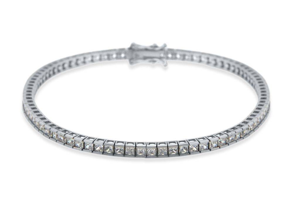 9ct white gold square princess cut cubic zirconia tennis bracelet with a push in catch and safety arms.