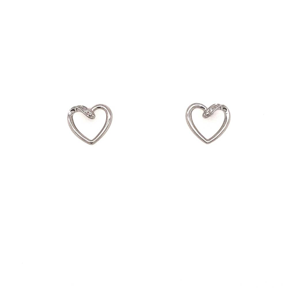 9ct white gold open heart stud earrings with one diamond set in each earring.