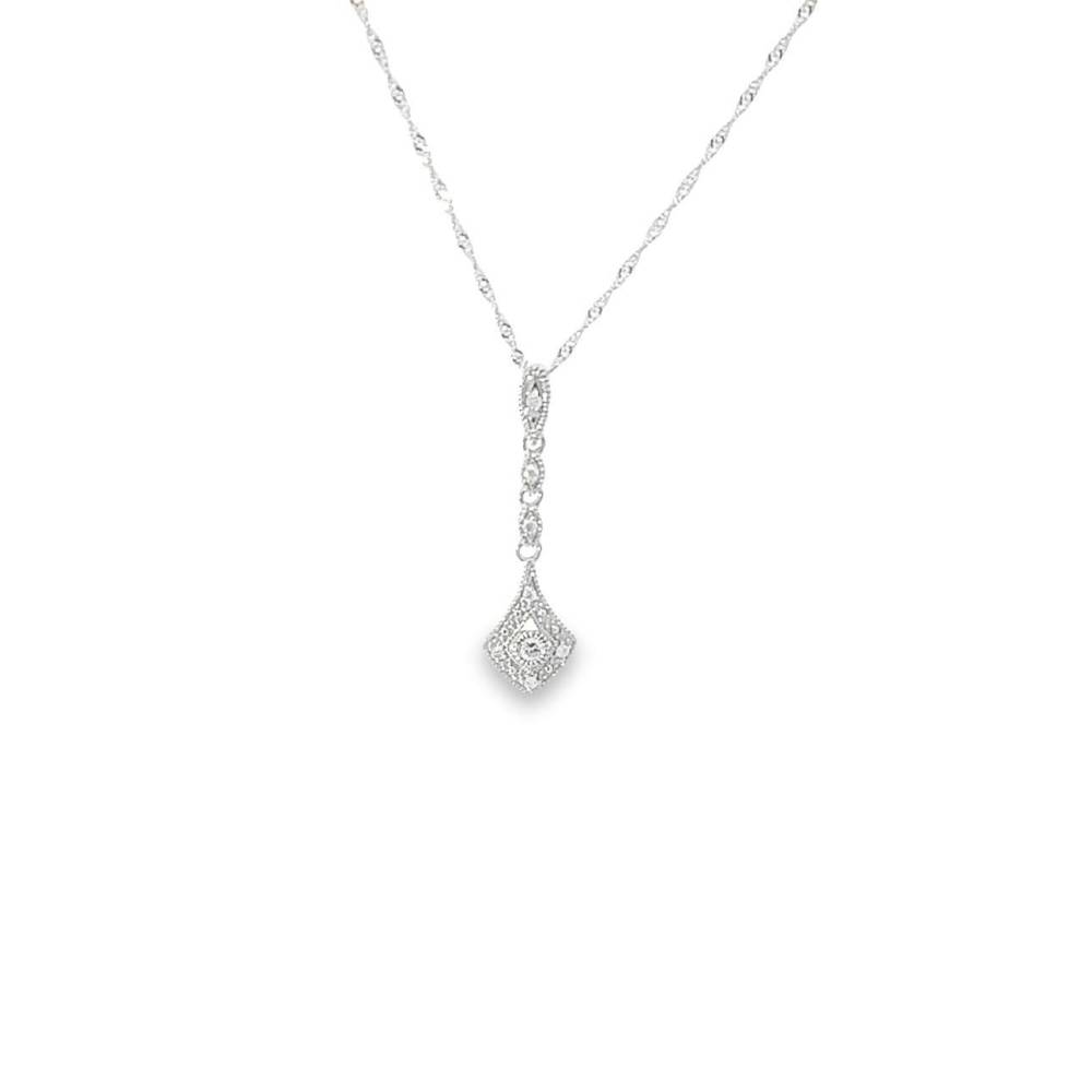 9ct white gold vintage style drop pendant set with round brilliant cut diamonds. This pendant comes on a 16″ twist curb chain.