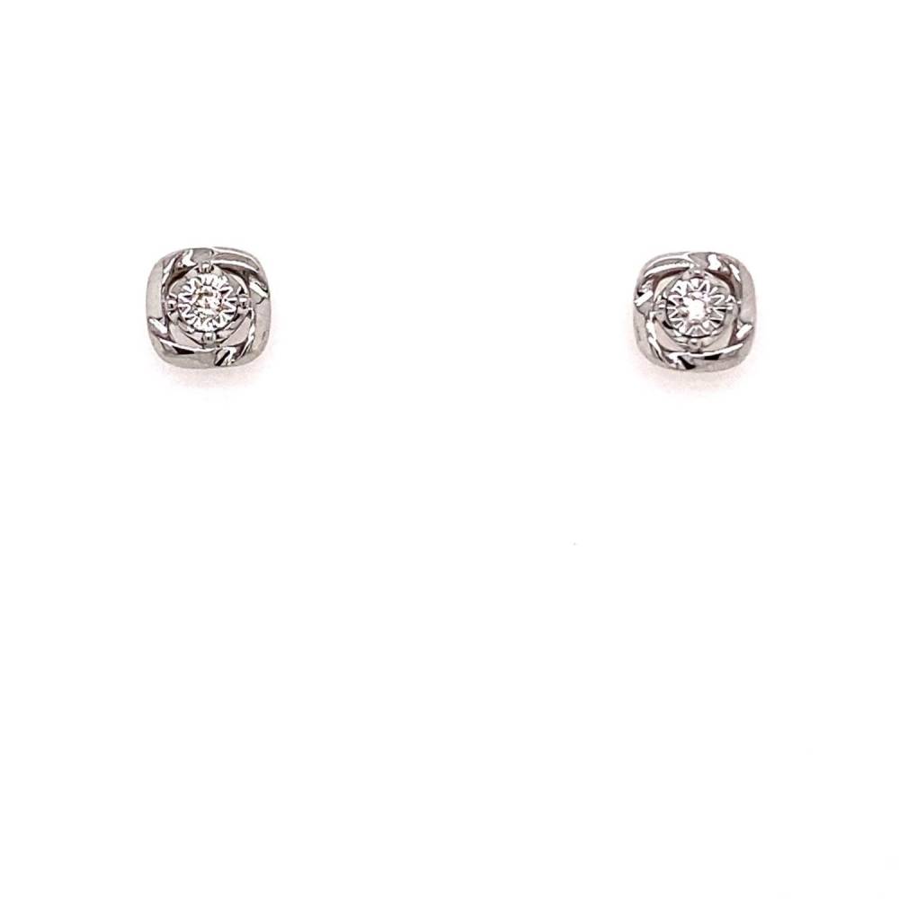 A single round brilliant cut diamond in an illusion setting surrounded by a twisted cushion shaped surround.