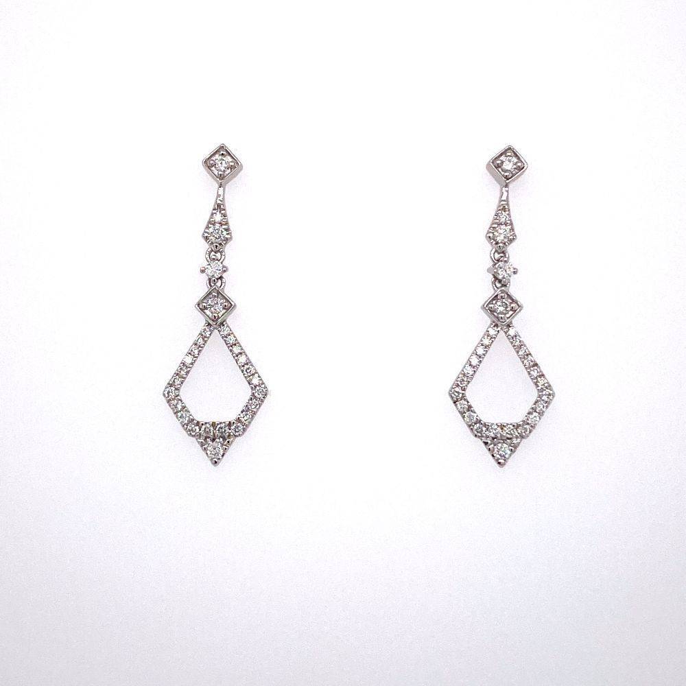 9ct white gold fancy shaped bar and diamond shape drop earrings set with round brilliant cut diamonds. 0.33ct total diamond weight.