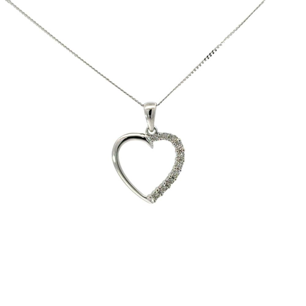9ct white gold open heart pendant half illusion set with diamonds. This pendant comes on a 42cm white gold chain.
