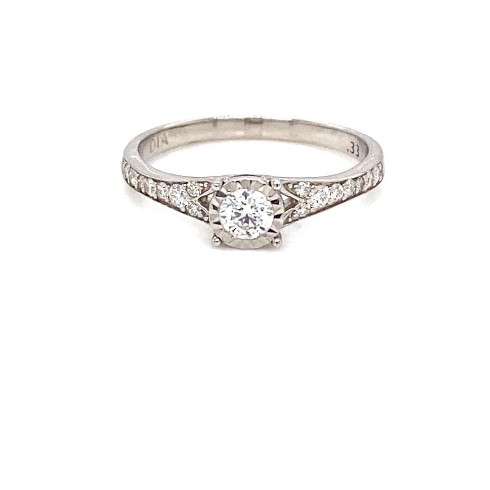 9ct white gold single stone diamond illusion set ring with wide tapering diamond set shoulders. 0.33ct total diamond weight.