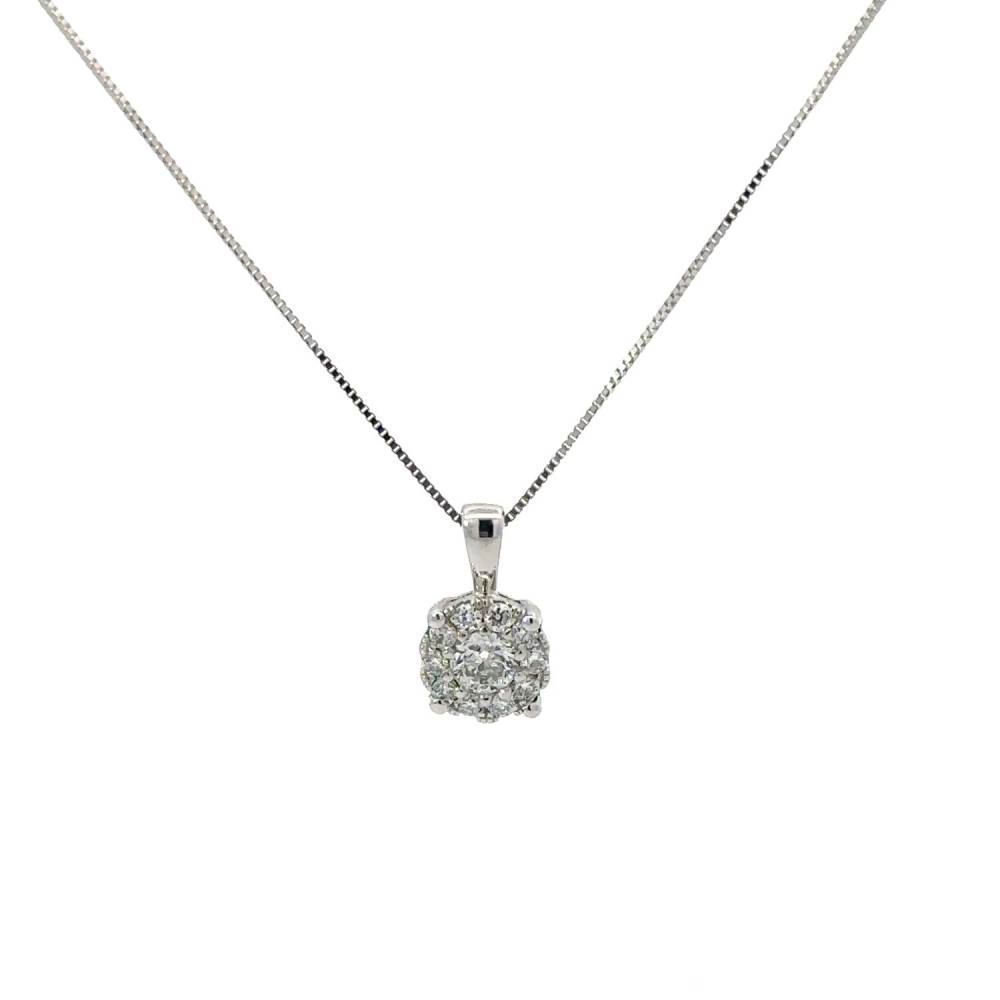 9ct white gold round invisible set diamond cluster pendant on a 18″ fine curb chain. This pendant is invisible set meaning you can barely see the setting so it gives the illusion of just one diamond rather than a cluster. 0.35ct total diamond weight.