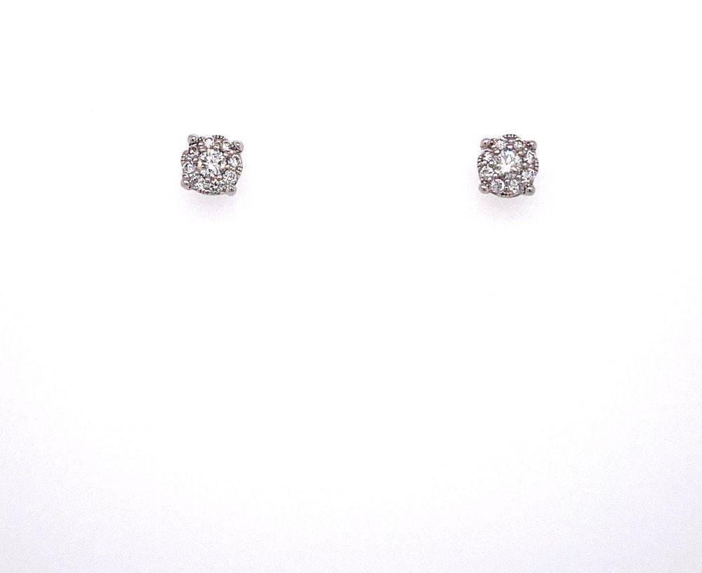 9ct white gold round brilliant cut diamond multi stone stud earrings. These earrings are cleverly set with an invisible setting making it look like there is just one diamond in each earring rather than several. Total diamond weight 0.26ct.