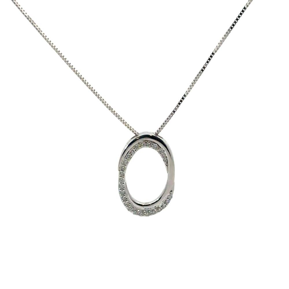 9ct white gold open ovals overlapping pendant set with an oval of round brilliant cut diamonds. This pendant comes on a 18″ chain. 0.10ct total diamond weight.