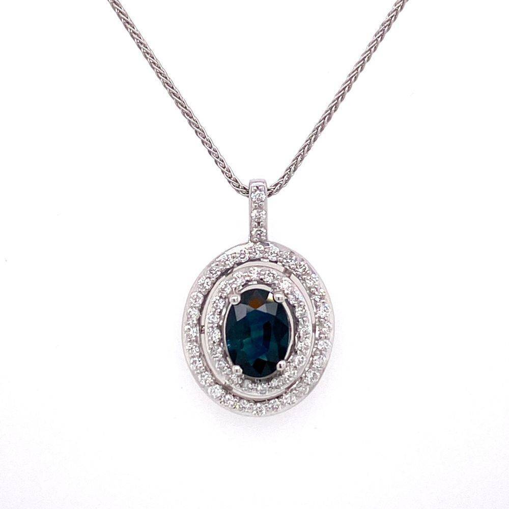 9ct white gold oval sapphire and round brilliant cut diamond two row halo cluster pendant on a 9ct white gold 18″” chain. 0.30ct total diamond weight.