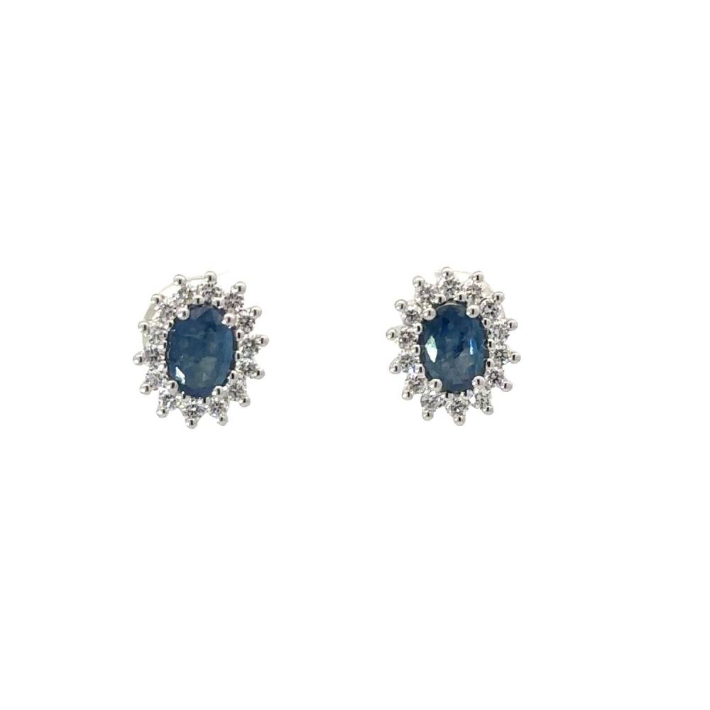 9ct white gold oval sapphire and round brilliant cut diamond cluster stud earrings. 0.40ct total diamond weight.