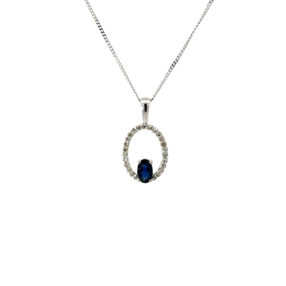 9ct white gold open oval diamond set pendant set with an oval blue sapphire. This pendant comes on a 16″ curb chain. 0.10ct total diamond weight. Matching earrings available.