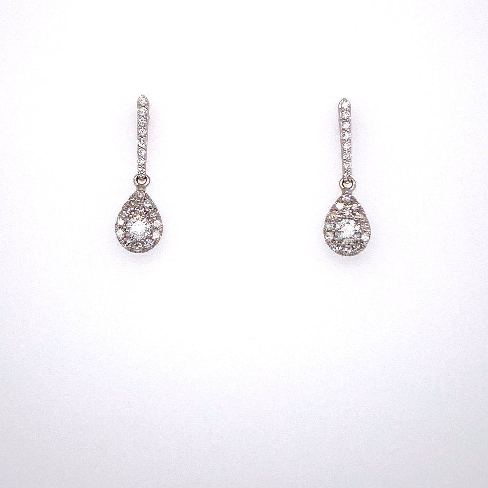 9ct white gold pear shaped diamond drop earrings set with round brilliant cut diamonds. A diamond set bar from with a round brilliant cut diamond pear shaped cluster. 0.54ct total diamond weight.
