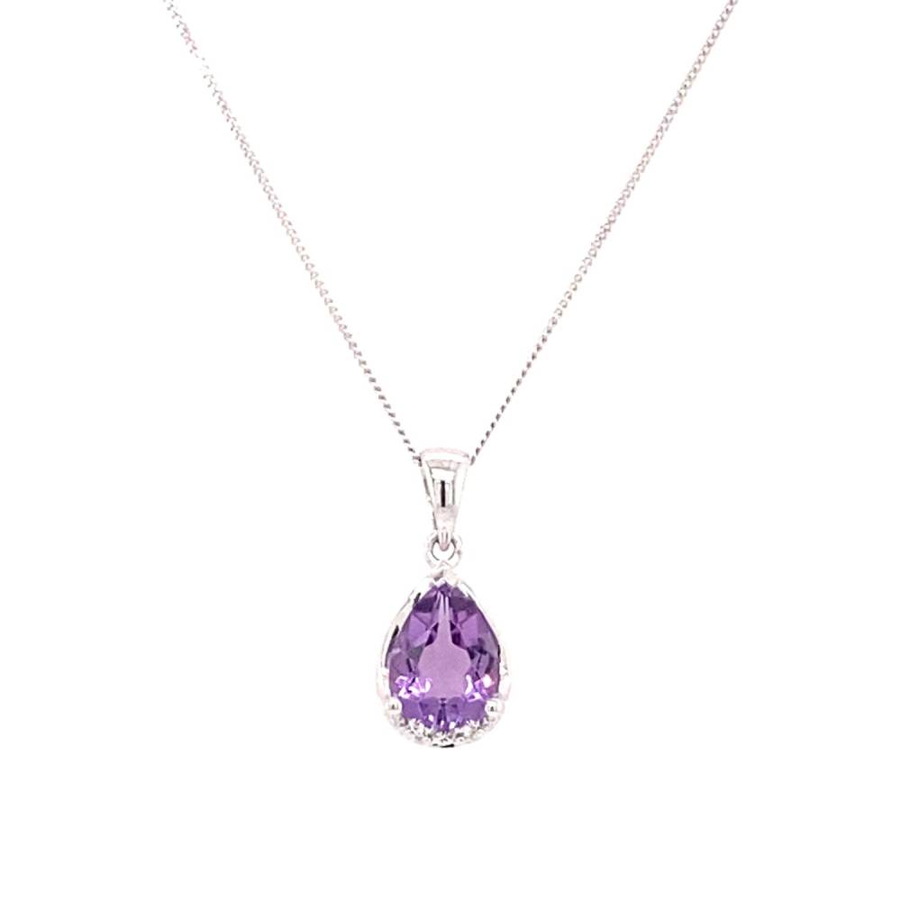 9ct white gold pear shaped amethyst and diamond pendant on a 9ct white gold 18″ chain.