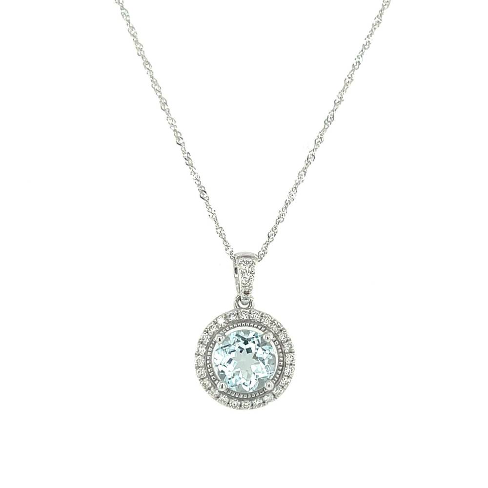 9ct white gold large round aquamarine surrounded by a halo of smaller round brilliant cut diamonds with a diamond set shackle. This pendant comes on a 16″ white gold twist curb chain.