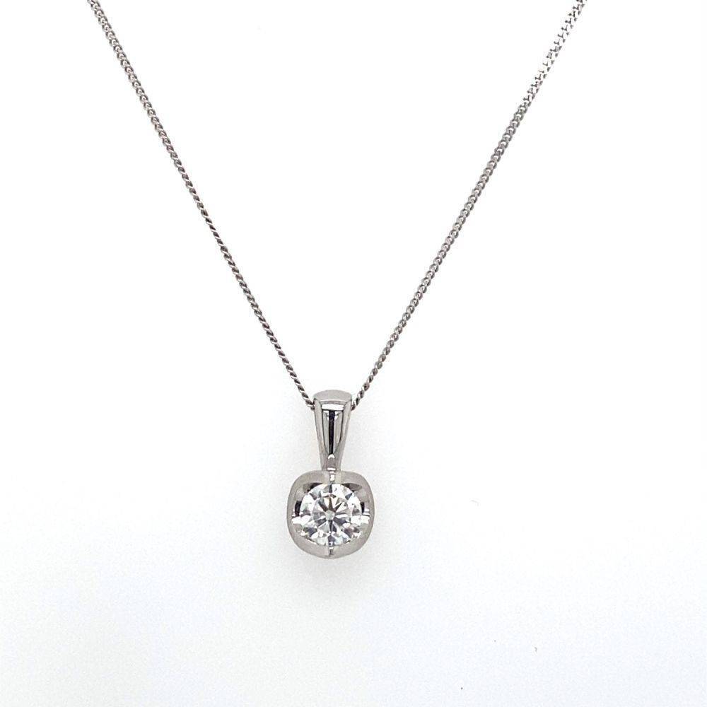 9ct white gold round brilliant cut diamond solitaire pendant in an arched setting on a 9ct white gold 18″” box chain. 0.30ct diamond.