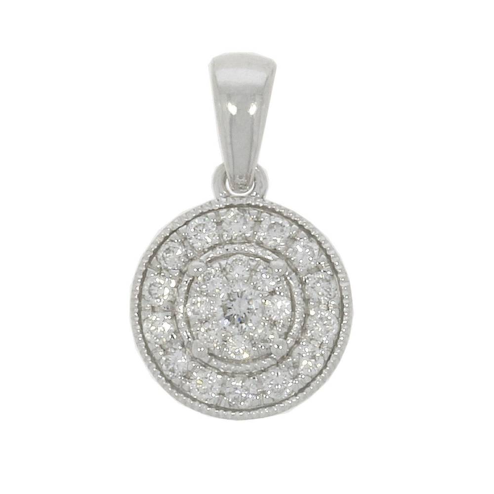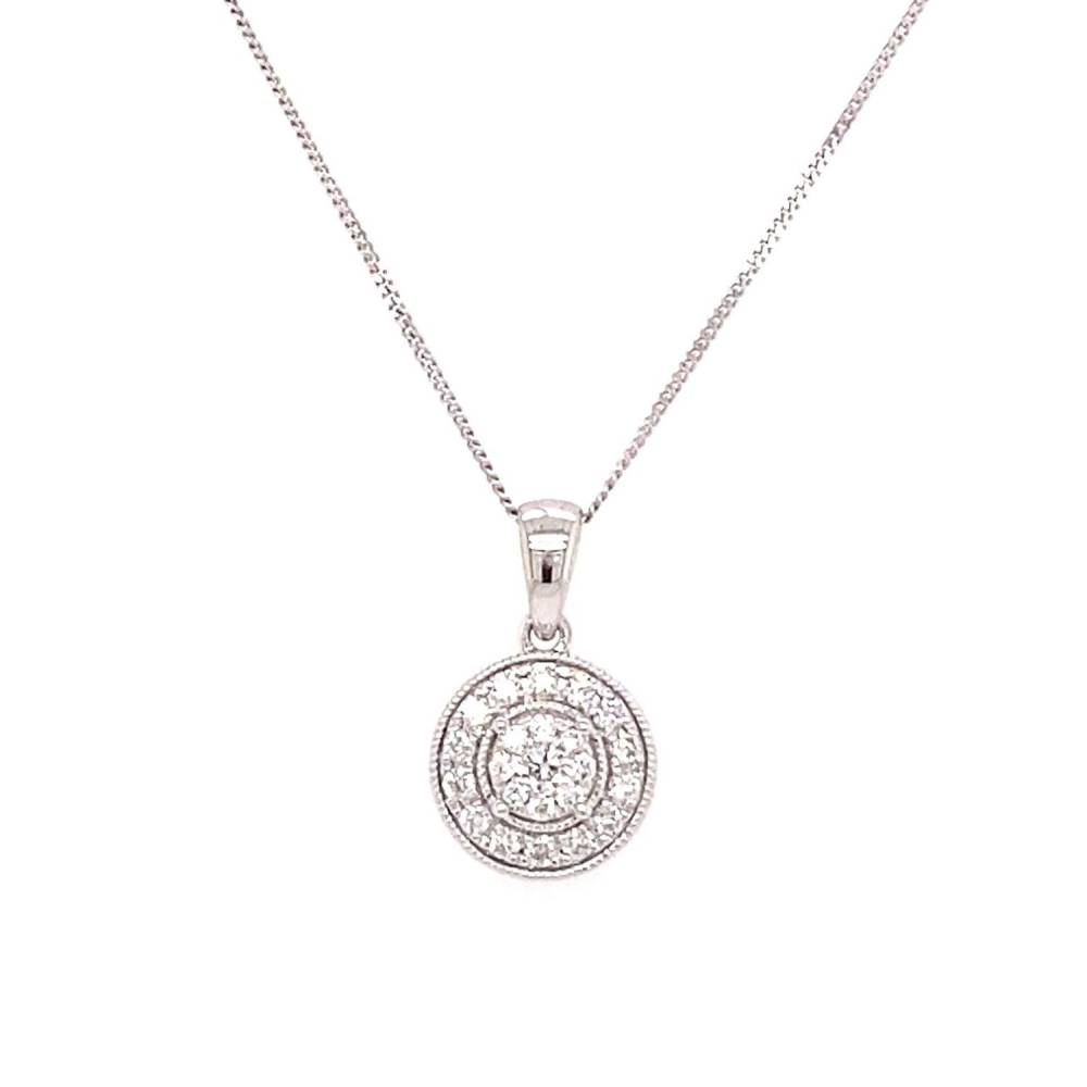 A round invisible diamond cluster surrounded by a halo of round brilliant cut diamonds all in a vintage millegrain setting. This pendant comes on a 9ct white gold 18″ chain.