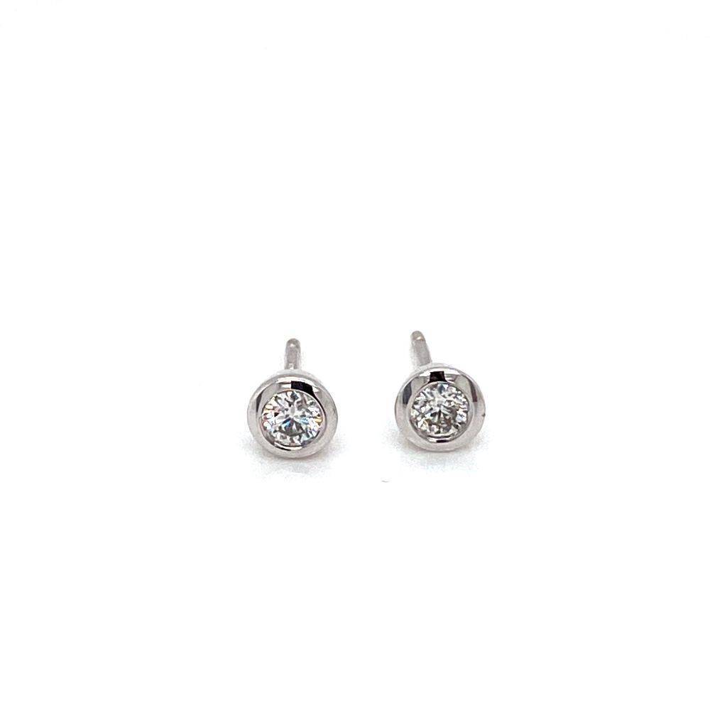9ct white gold single stone round brilliant cut diamond stud earrings. In a rub over setting with pillar and scroll fittings. 0.20ct total diamond weight (0.10ct per earring). G/H colour. I2 clarity.