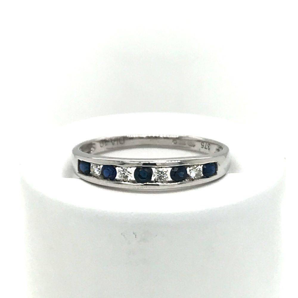 9ct white gold nine stone round sapphire and round brilliant cut diamond channel set ring.