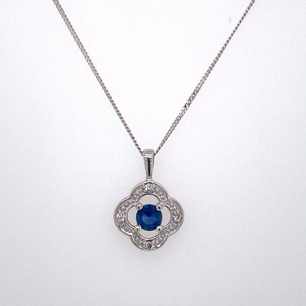 9ct white gold sapphire and diamond pendant. A round blue sapphire surrounded by a four leaf clover shape grain set with round brilliant cut diamonds. This pendant comes on a 18″” 9ct white gold chain.