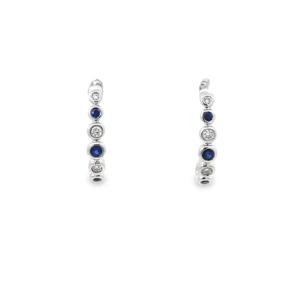 9ct white gold round sapphire and round brilliant cut diamond hoop earrings, each in rub over settings.