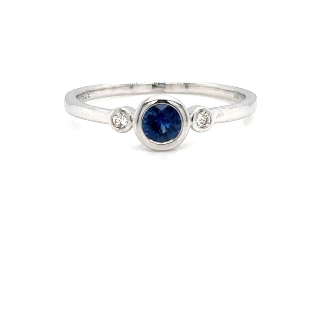 A beautiful contemporary three stone ring with a central round sapphire and a round brilliant cut diamond either side each in a rub over setting in a 9ct white gold ring. Sapphire 0.27ct & diamonds 0.03ct total weight.